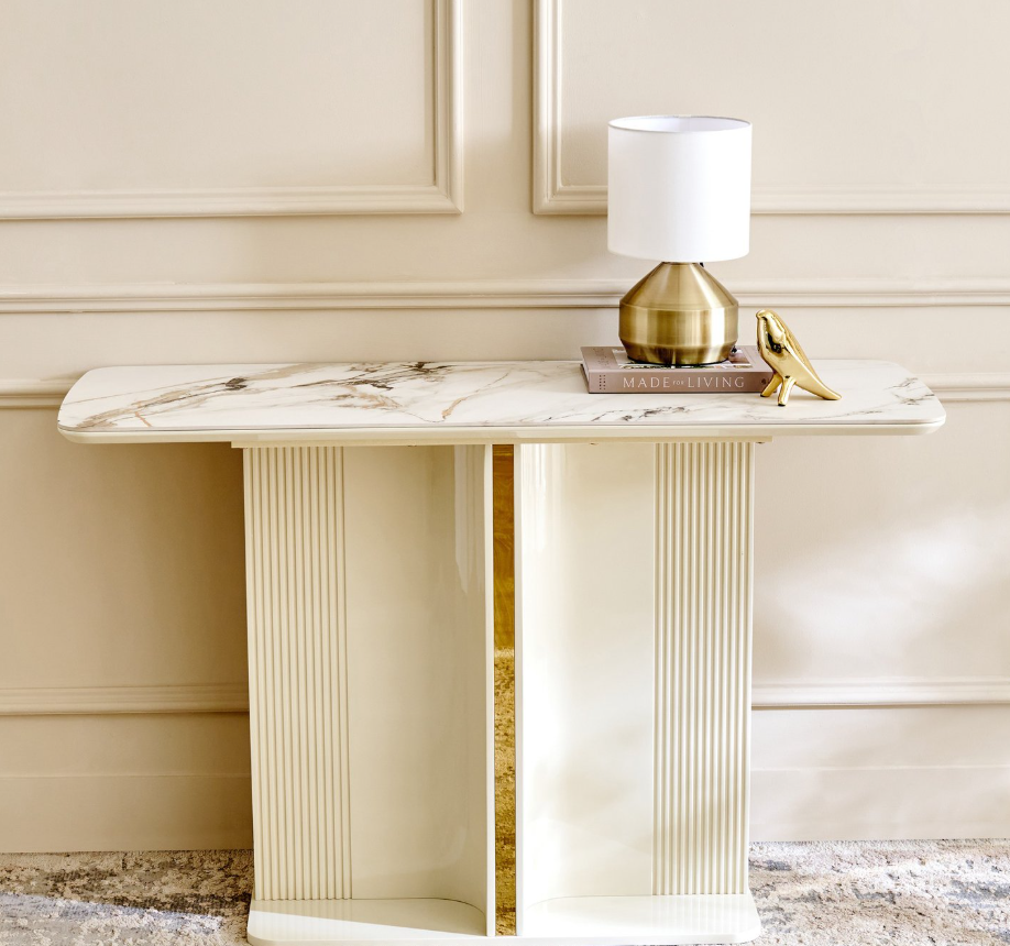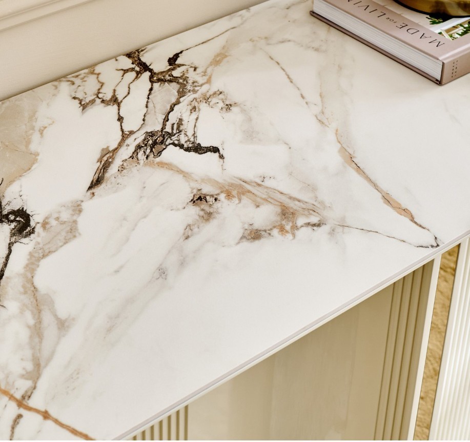Upgrade your living room with this stylish and durable console table. Crafted with an engineered wood frame, a ceramic top, and sturdy metal legs, it is built for everyday use.