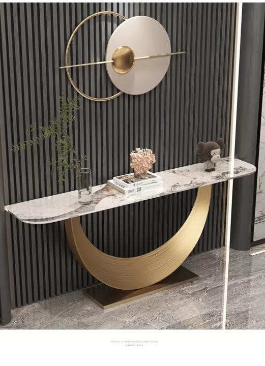 The Moon Console Table is made of a sintered stone top and a shiny gold stainless steel base.
