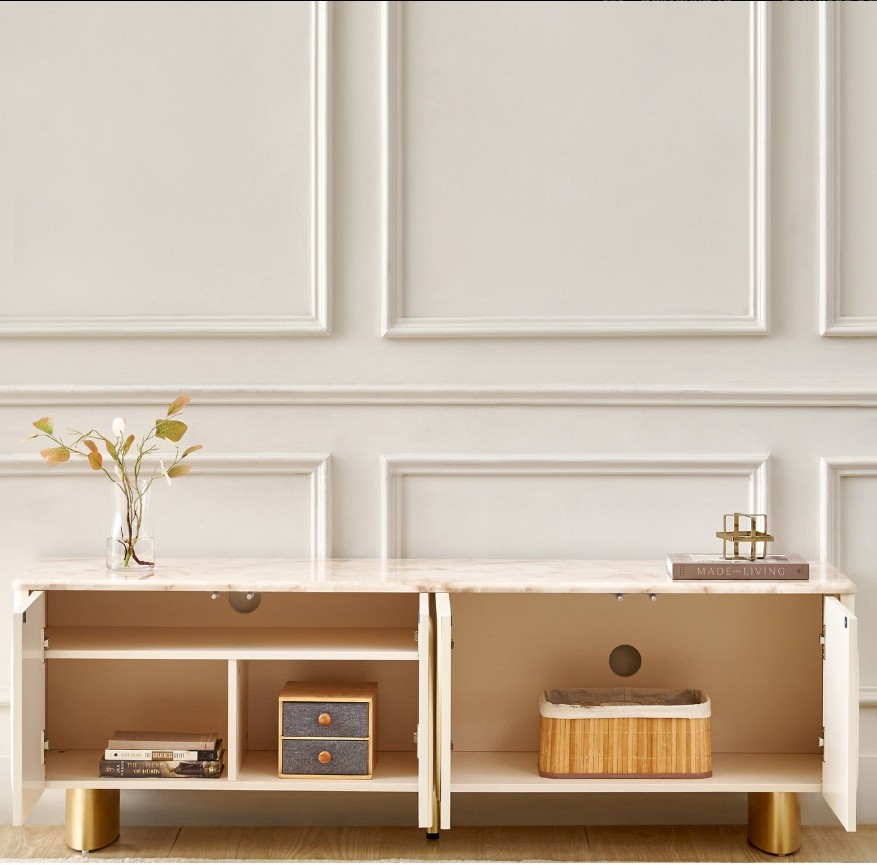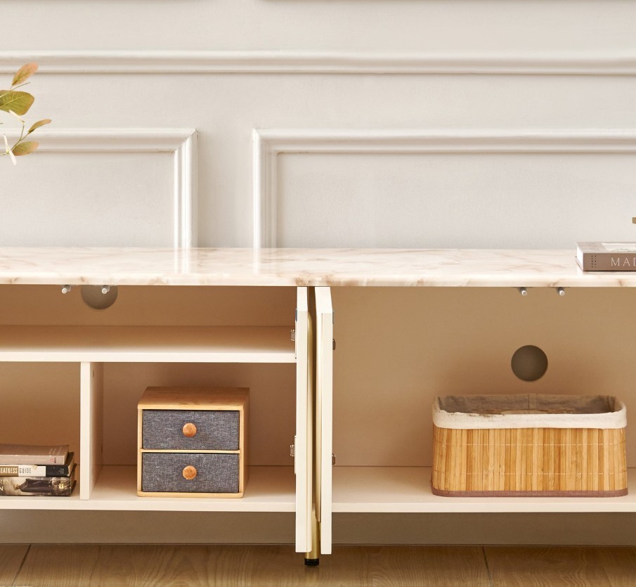 Add modern sophistication to your living space with this TV unit made from durable MDF with a smooth lacquer finish. It features a heat-resistant faux marble top and 4 spacious shelves, combining elegant design with practical storage.