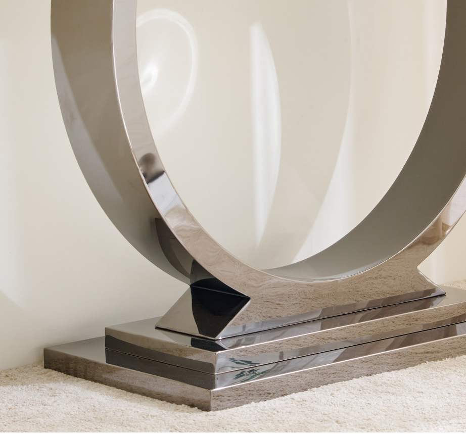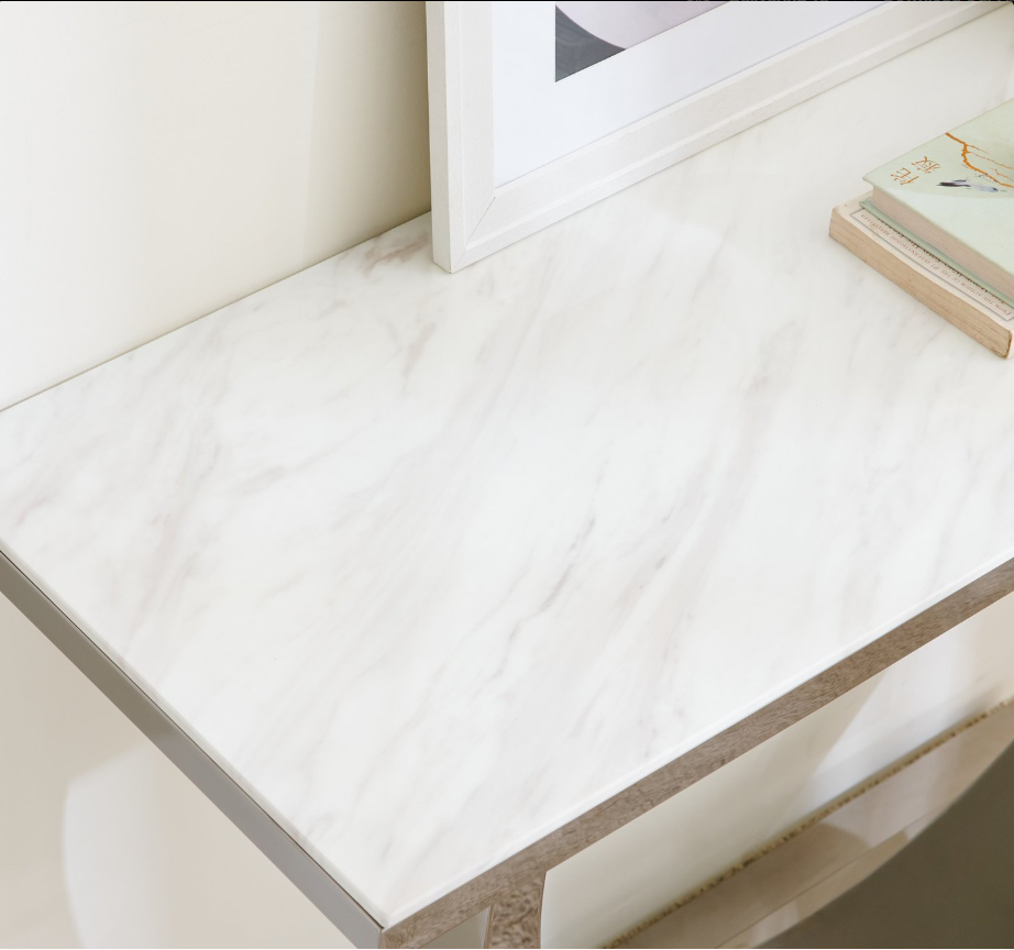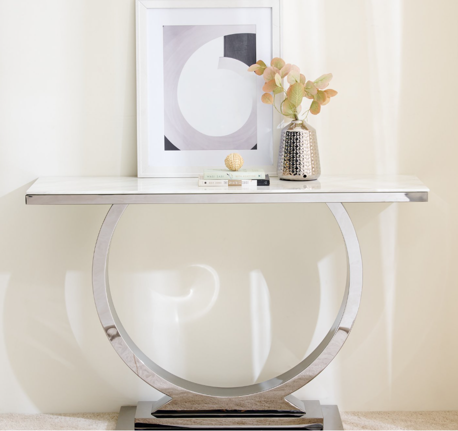 Enhance your living room or hallway with this stylish console table, designed with a sturdy stainless steel frame and a tempered glass top for strength and stability. The tabletop features a printed marble-effect design, offering the elegant look of marble with a smooth finish. The electroplated metal legs are built to resist tarnishing and corrosion, while adding durability and impact resistance for long-lasting use.