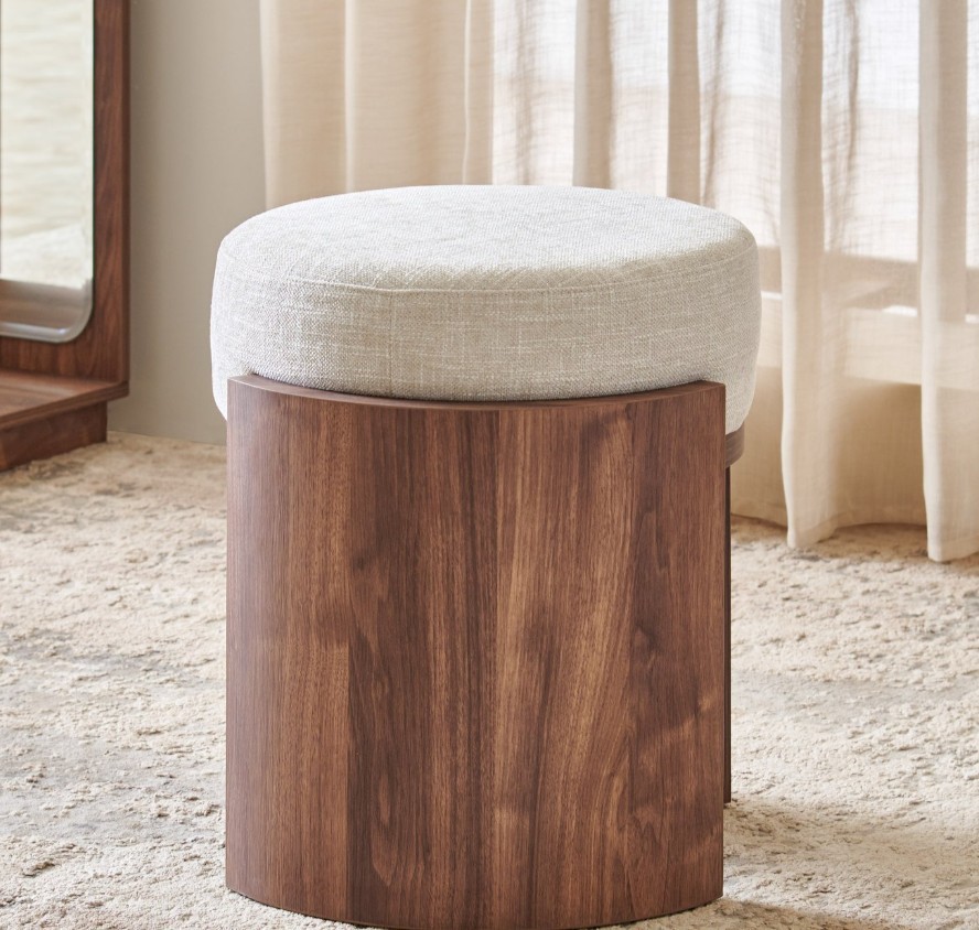 Complete your vanity setup with this elegant dresser stool. Made from engineered wood with a melamine finish, it features a cushioned seat upholstered in breathable, easy-to-clean polyester fabric supported by a sturdy tri-leg frame for daily comfort and durability.