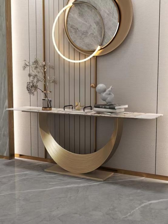 The Moon Console Table is made of a sintered stone top and a shiny gold stainless steel base.