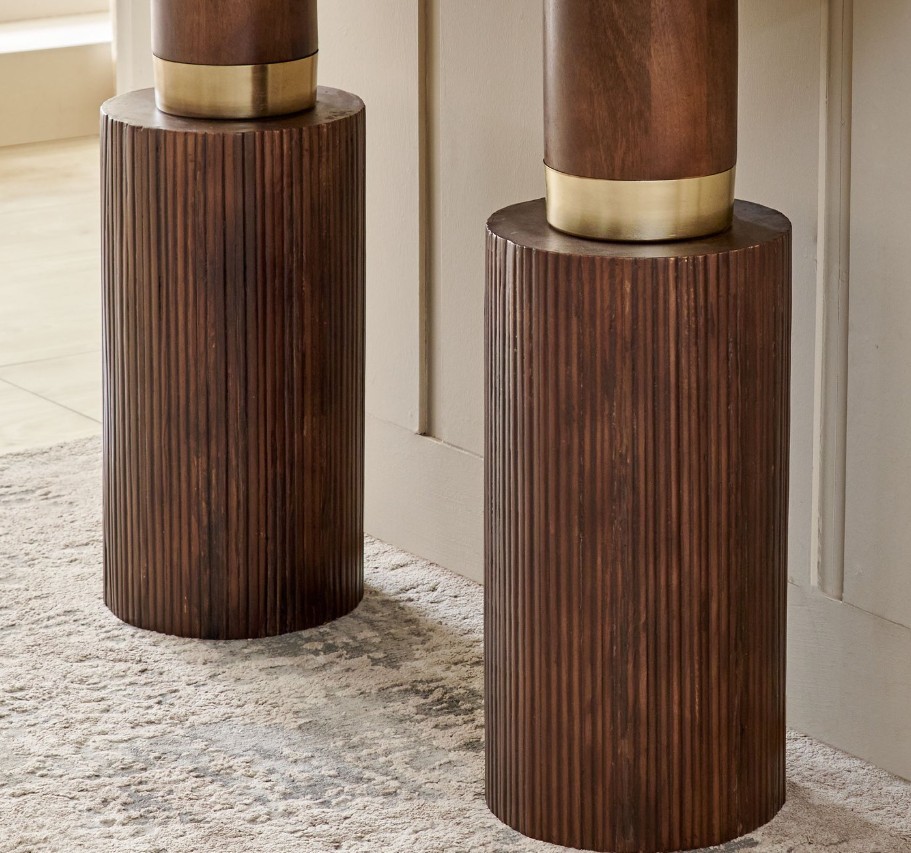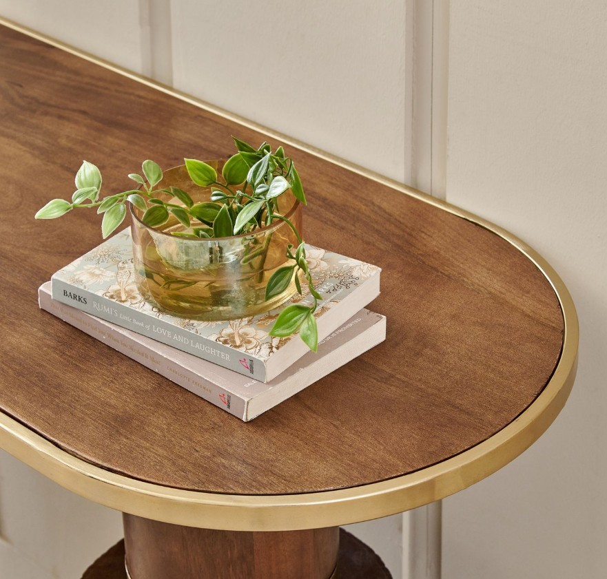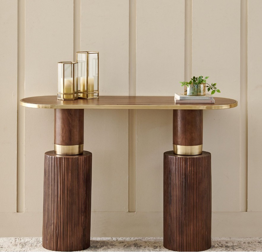 Add elegance and functionality to your home with this stylish console table. Crafted from kiln-dried, chemically treated mango wood, it offers durability and resistance to seasonal changes. Laminated wooden legs provide strong support, while electroplated gold steel accents give it a refined, modern touch—perfect for entryways, living rooms, or dining areas.