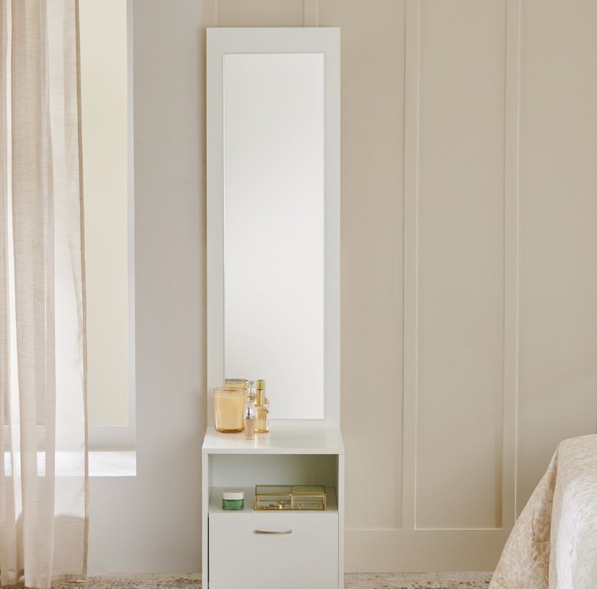 Transform your bedroom with this stylish dresser made from durable engineered wood with a protective melamine finish. It features a 4mm mirror for a clear full-length view, along with convenient shelves and a drawer to neatly organise cosmetics and accessories.