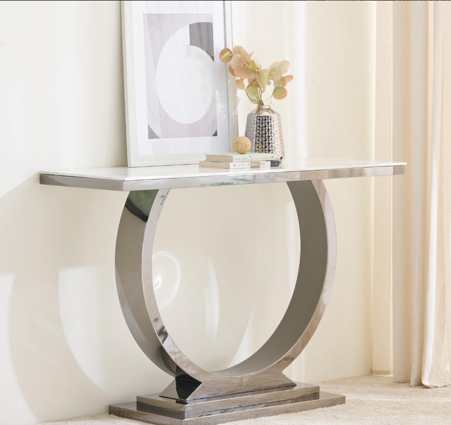 Enhance your living room or hallway with this stylish console table, designed with a sturdy stainless steel frame and a tempered glass top for strength and stability. The tabletop features a printed marble-effect design, offering the elegant look of marble with a smooth finish. The electroplated metal legs are built to resist tarnishing and corrosion, while adding durability and impact resistance for long-lasting use.